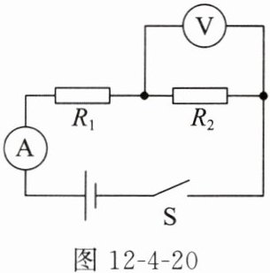 10. 如图 12 - 4 - 20 所示的电路中,电阻 $ R_1 = 10 \, \Omega $。闭合开关 $ S $ 后,电压表的示数为 $ 12 \, V $,电流表的示数为 $ 0.5 \, A $。
