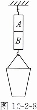 10. 【核心素养 | 科学探究】为了证明分子之间有引力,小明在实验室中把两个铅柱的底面削平、削净,然后紧紧地压在一起,在其下方悬挂重物,如图 10 - 2 - 8 所示。铅柱 A 和铅柱 B 所受的重力均为 2N,两个铅柱接触面的面积为$ 3cm^2,$当悬挂的重物所受的重力为 20N 时,两个铅柱没有被拉开。于是,小明认为这个实验证明了分子之间存在引力。小华观测到该实验室的大气压为$ 1×10^5Pa,$于是他认为两个铅柱之所以没被拉开,是因为大气压的作用。请你利用所学知识和上述数据,判断小明做的铅柱实验能否证明分子之间存在引力。请写出计算、推理过程和结论。