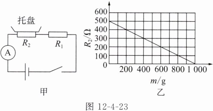 13. 图 12 - 4 - 23 甲是某科技小组制作的电子秤的原理示意图,$ R_1 $ 为定值电阻;托盘下方的电阻 $ R_2 $ 为力敏电阻,其电阻大小与托盘内所放物体的质量 $ m $ 的关系如图 12 - 4 - 23 乙所示。已知电源电压为 $ 6 \, V $。