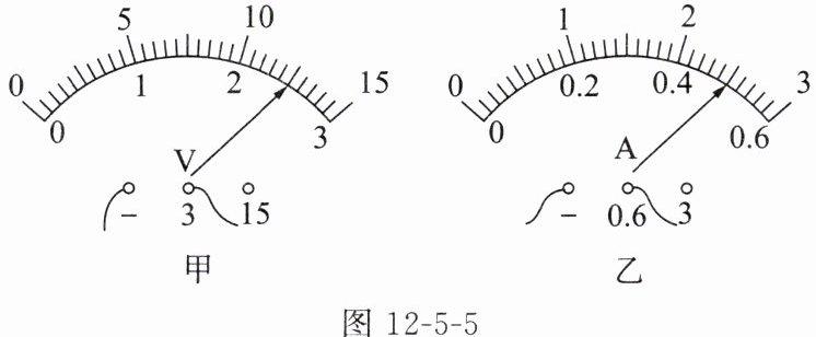 。小安用伏安法测量电阻R的阻值时,当滑动变阻器的滑动头移动到某一位置时,并联在电阻R两端的电压表的示数如图12-5-5甲所示,与电阻R串联的电流表的示数如图12-5-5乙所示,则电压表的示数为______2.5