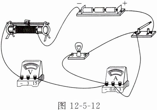 (4)在完成以上实验后,小组同学还想测量一个正常工作电压为3.8V的小灯泡正常发光时的电阻,于是他们找来一个6V的电源,但发现电压表0~15V的量程已损坏,只有0~3V的量程可用,其他器材不变。请你将电压表接到图12-5-15中的适当位置,以便完成实验。