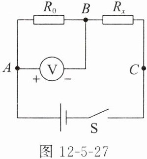 5. 小明利用一个电压表和一个阻值已知的定值电阻$R_{0}$以及其他满足实验要求的器材,设计了如图12-5-27所示的电路图,用以测量未知电阻$R_{x}$的阻值。请你帮他将实验步骤补充完整。