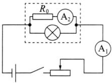 6. 小礼手里有一个标有“3.8 V”字样的小灯泡,他想知道小灯泡正常发光时的电阻,他认为可以用一个已知阻值为$R_{0}$的定值电阻和两个电流表等测出小灯泡正常发光时的电阻。