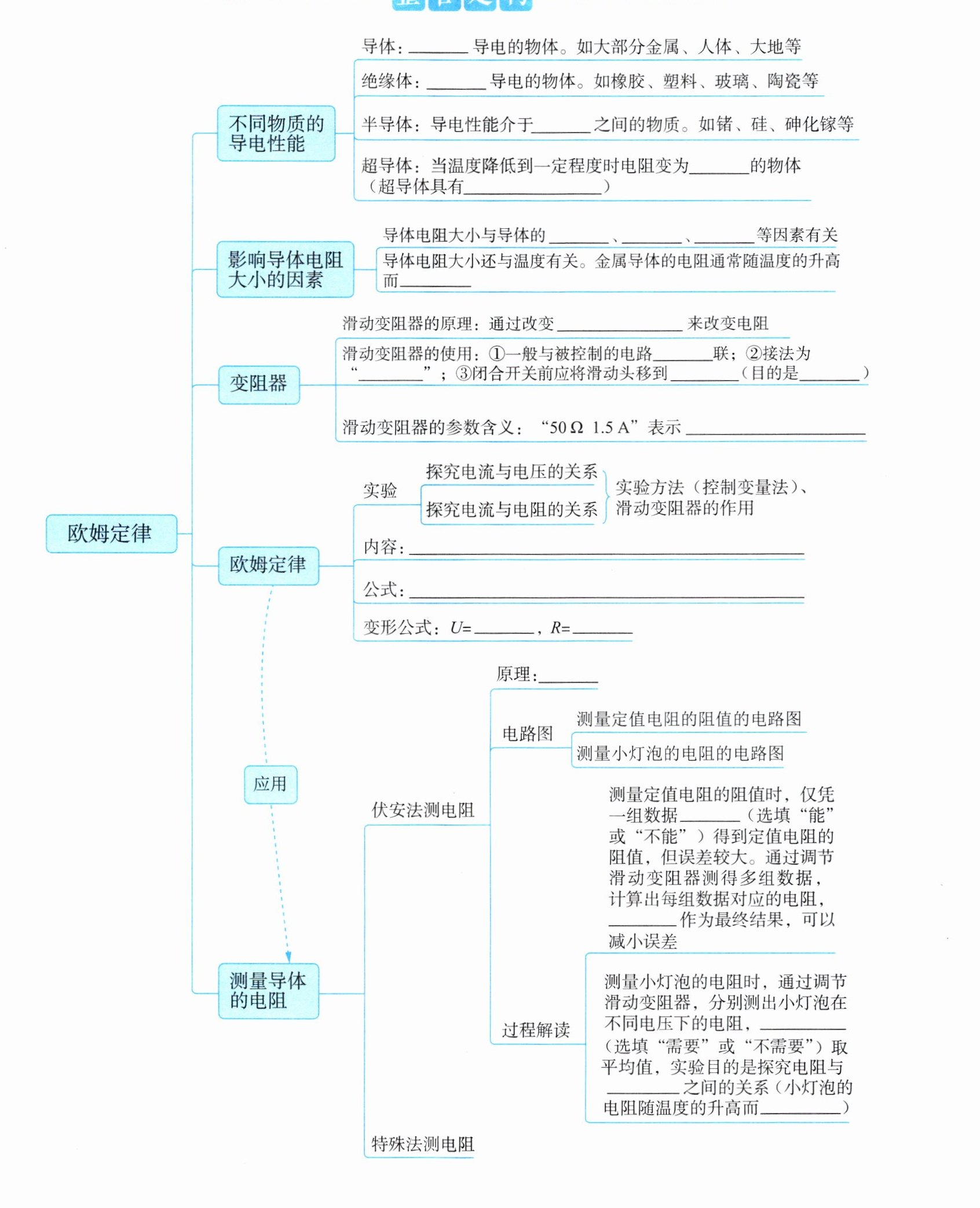 容易 不容易 导体和绝缘体 零 零电阻特性 材料 长度 横截面积 增大 接入电路的电阻线的长度 串 一上一下 阻值最大处 保护电路 其最大阻值为50Ω,允许通过的最大电流为1.5A 通过导体的电流,与导体两端的电压成正比,与导体的电阻成反比 $I=\frac{U}{R}$ IR $\frac{U}{I}$ $R=\frac{U}{I}$ 能 取平均值 不需要 温度 增大
