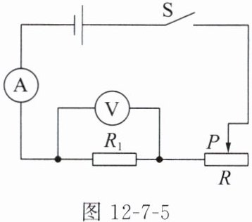 如图12-7-5所示的电路中,电源电压为6V且保持不变,定值电阻$R_1$的阻值为10Ω,滑动变阻器R的最大阻值为20Ω。开关S闭合,滑动变阻器R的滑动头P位于最右端时,电压表的示数为