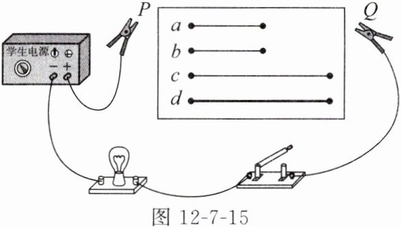 2. 利用如图12-7-15所示的电路探究影响导体电阻大小的因素,演示板上固定有a、b、c、d四根合金丝,长度关系为$L_a = L_b = \frac{1}{2}L_c = \frac{1}{2}L_d$,横截面积关系为$S_a = S_b = S_c = \frac{1}{2}S_d$,其中a、c、d均为镍铬合金丝,b为锰铜合金丝。将夹子P、Q分别接在同一根合金丝两端的接线柱上,下列说法正确的是(