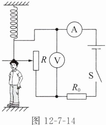 为了参加全国青少年创新大赛,小强运用所学的电学知识设计了一个电子身高测量仪(如图12-7-14所示),其中,定值电阻R₀= 5Ω,电源电压恒为4.5V;R是竖直放置的硬电阻棒,总长为45cm,总电阻为15Ω,其接入电路的电阻与接入电路的长度成正比;电压表的量程为0~3V,电流表的量程为0~0.6A。