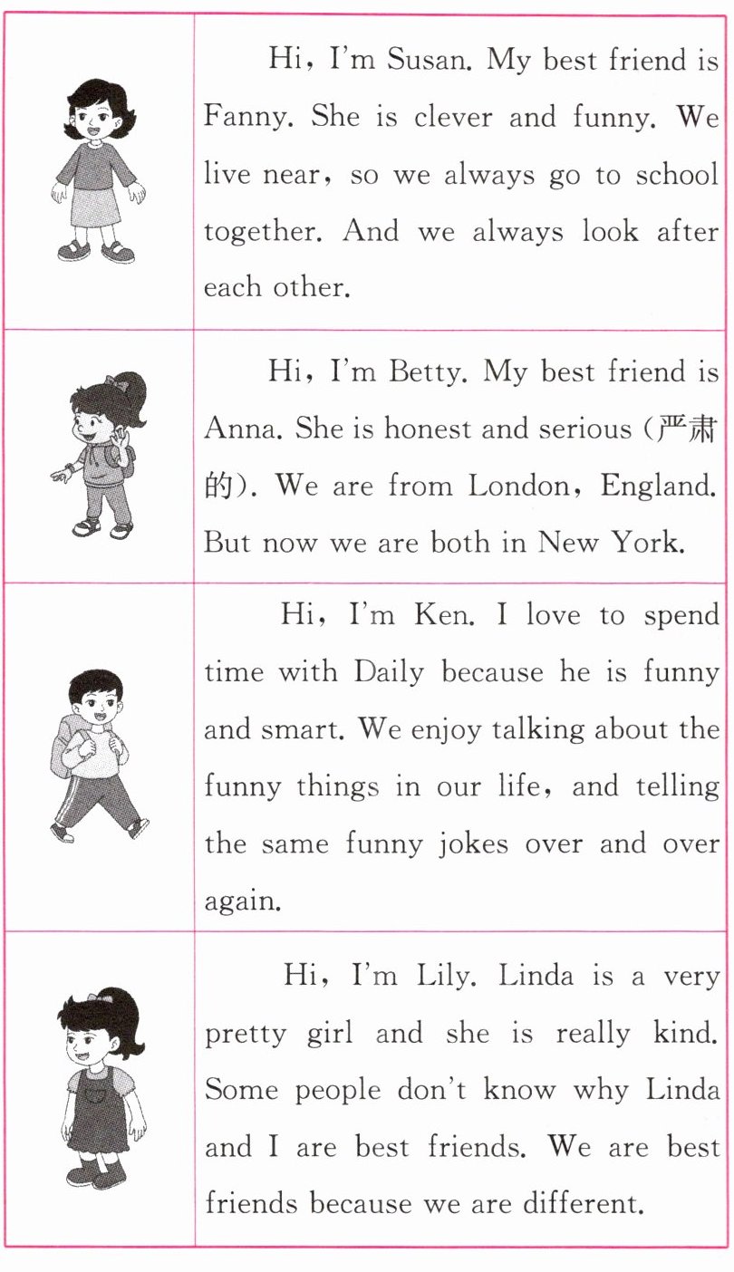 Hi, I’m Betty. My best friend is Anna. She is honest and serious(严肃的). We are from London, England. But now we are both in New York.