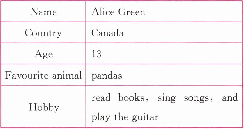 Alice's full name is Alice Green. She comes from Canada. She is thirteen years old now. Alice likes pandas very much. She thinks they are very cute. She wants to come to China to see pandas. In her free time, Alice loves reading books at home. She also likes singing songs and playing the guitar.