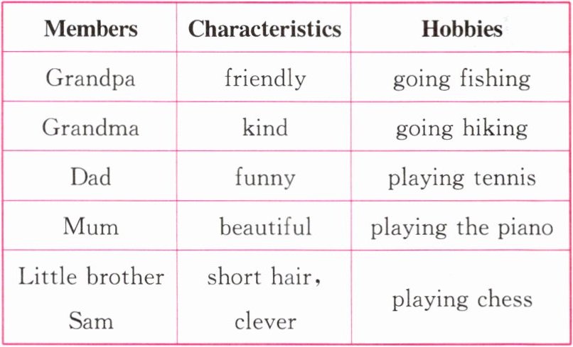My grandpa is friendly to others. He likes going fishing with his friends. My grandma is a kind woman. She often goes hiking at weekends. My dad is so funny and he always makes us laugh. And he likes playing tennis. He spends an hour playing it every day. My mum is beautiful. She often plays the piano for us. Sam is my little brother. He has short hair and he is very clever. He can play chess really well.