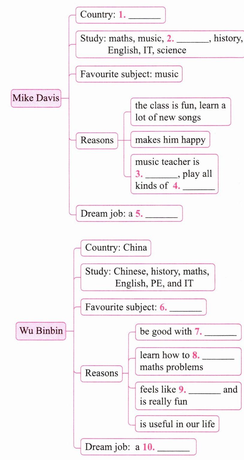 Mike is a student in Canada. He has maths, music, French, history, English, IT, science and gym this term. His favourite subject is music. He likes it because the class is fun and he learns a lot of new songs. He wants to be a singer in the future.