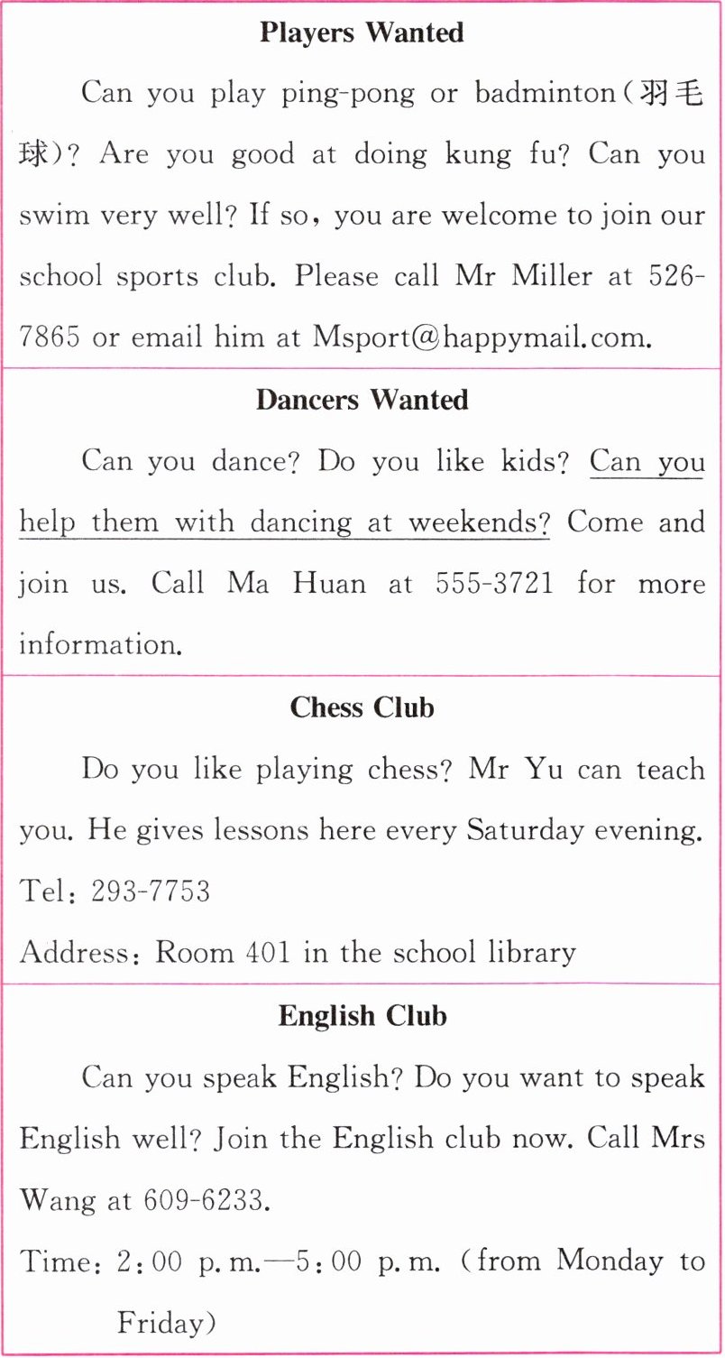 Can you play ping-pong or badminton(羽毛球)? Are you good at doing kung fu? Can you swim very well? If so,you are welcome to join our school sports club. Please call Mr Miller at 526-7865 or email him at Msport@happymail.com.