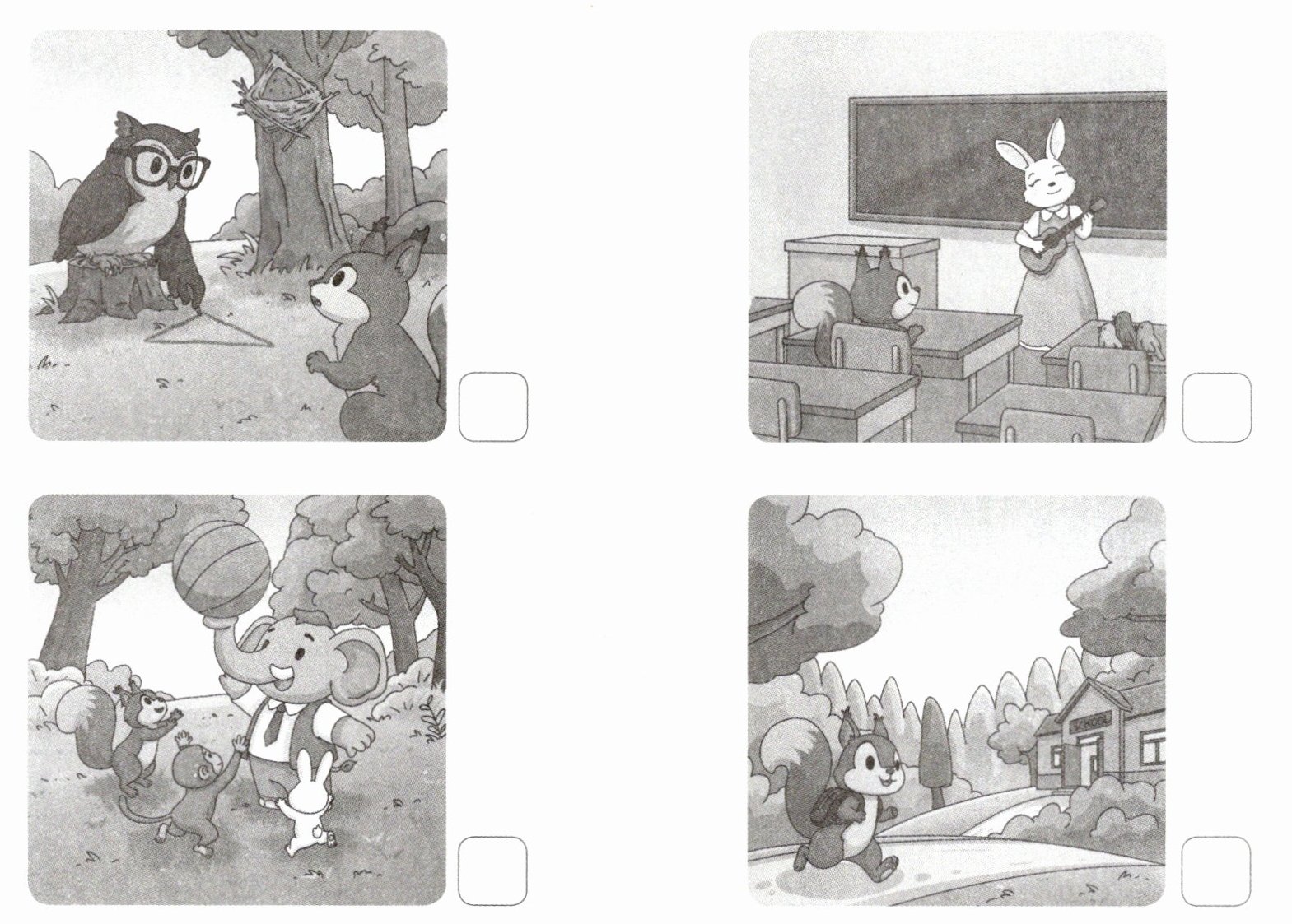 五、Read and order. 松鼠Qiqi今天去了新学校,发生了什么事?读一读,根据故事内容给图片排序。