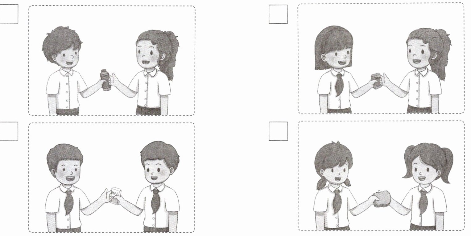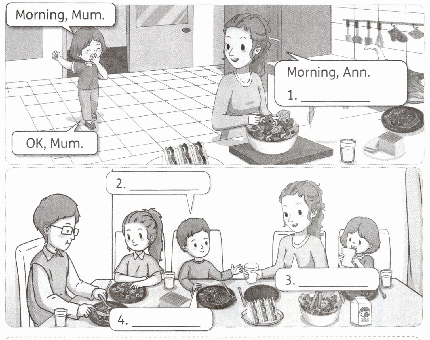 二、Read and choose. 这是Eve一家清晨起床后的情景,他们在说什么?读一读,选择合适的句子补全对话。