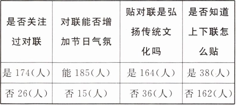 10. 下面是活动中整理的关于对联的调查统计表,请用简洁的语言写出你从表格中得出的结论。