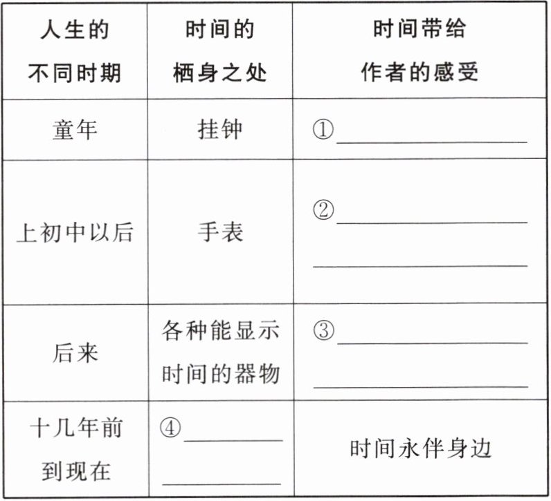 ④我上了初中以后,手表就比较普及了。我看见时间躲在一个小小的圆盘里,在我们的手腕上跳舞。手表静悄悄的,不像墙上的挂钟行进得那么清脆悦耳,“嘀嗒——嘀嗒——”的声音不绝于耳。手表里的时间给我一种鬼鬼祟祟的感觉,从这里走出来的时间因为没有声音而少了几分气势。这样的时间仿佛也没了威严,不值得被尊重,所以明明到了上课时间,我还会磨蹭一两分钟再进教室,手表里的时间也就因此显得有些落寞。