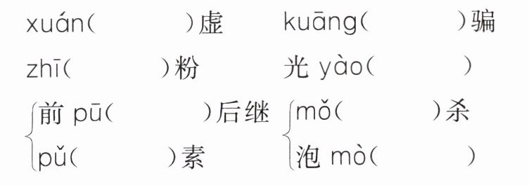 (1)渺茫 (2)为民请命 (3)怀古伤今 (4)地大物博 (5)玄虚 (6)诓骗 (7)摧残 (8)抹杀 (9)诬蔑 (10)自欺欺人
