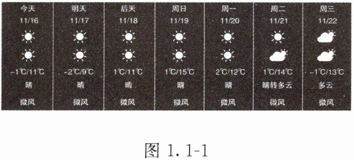 如图 1.1 - 1 为某城市 11 月 16 日—11 月 22 日的天气预报.