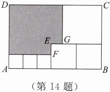 14. 如图,由三种不同的正方形(共6个)与一个有缺角的矩形(阴影部分)拼接成长方形$ABCD$,已知$EF = EG = 1$,最小正方形的边长为$a$.