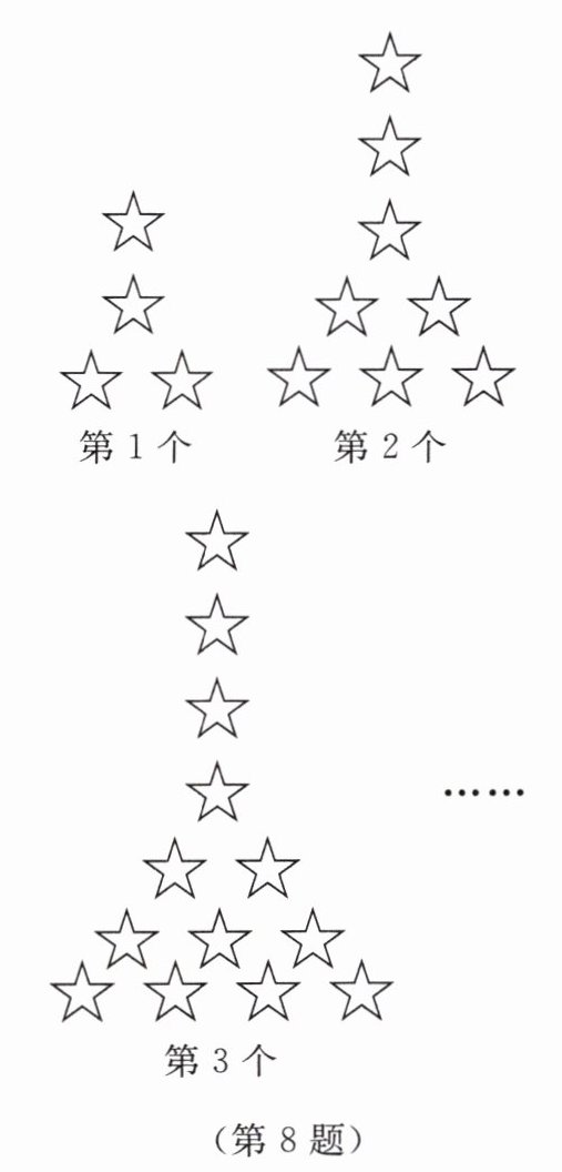 8. 如图是由同样大小的星星按照一定规律摆放的,第 $ 1 $ 个图形中有 $ 4 $ 颗星星,第 $ 2 $ 个图形中有 $ 8 $ 颗星星,第 $ 3 $ 个图形中有 $ 13 $ 颗星星,$ \cdots \cdots $ 第 $ 10 $ 个图形中星星的颗数为()。