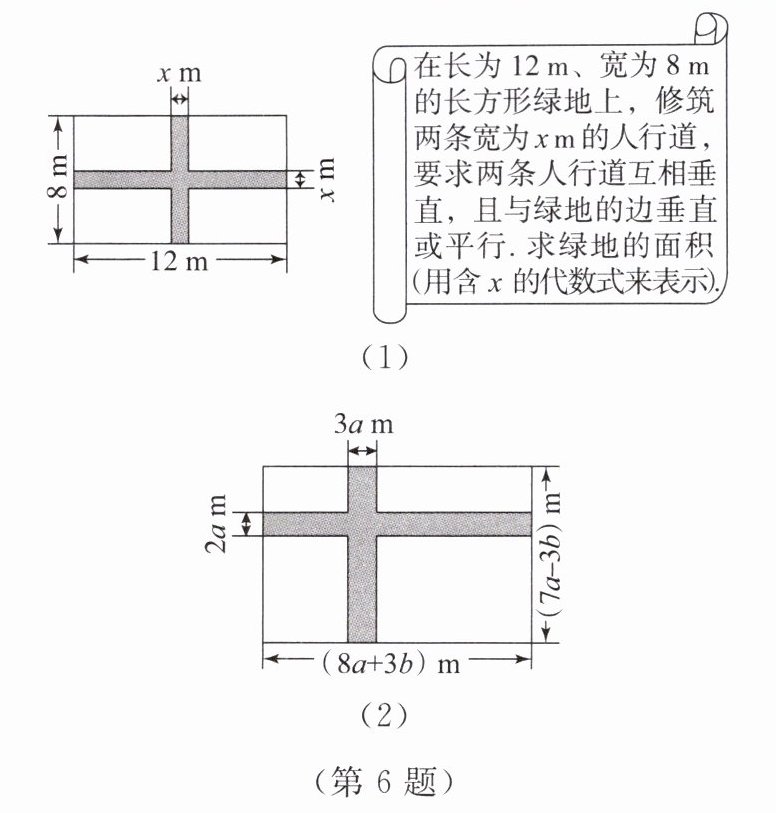 .(2)如图(2),有一块长为 $(8a + 3b)$ m、宽为 $(7a - 3b)$ m 的长方形空地,计划修筑东西、南北走向的两条道路,其余进行绿化. 已知两条道路的宽分别为 $2a$ m 和 $3a$ m,求绿化的面积(用含 $a$,$b$ 的代数式来表示).
