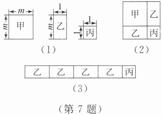 7. 现有甲、乙、丙三种长方形卡片各若干张,卡片的边长如图(1)所示$(1 < m < 2)$. 某同学分别用这些卡片拼出了两个长方形(不重叠无缝隙),如图(2)和图(3),其面积分别记为$S_1$,$S_2$.