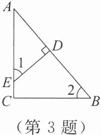 3. 如图,$E是\triangle ABC的边AC$上一点,过点$E作ED\perp AB$,垂足为$D$。若$\angle 1 = \angle 2$,则$\triangle ABC$是(