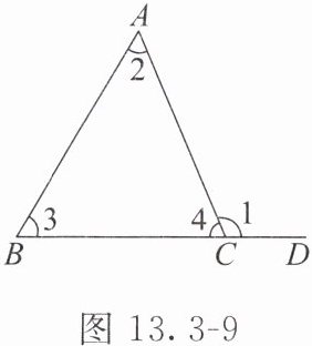 1. 三角形的外角的定义:如图 13.3 - 9,把△ABC 的一边 BC 延长,得到∠ACD. 像这样,三角形的一边与另一边的