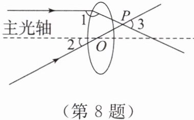 8. (跨学科融合)如图,一束平行于主光轴的光经凸透镜折射后,其折射光线与一束经过光心 O 的光相交于点 P. 若∠1 = 155°,∠2 = 28°,则∠3 =