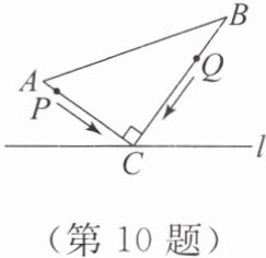 10. (分类思想)如图,在△ABC 中,∠ACB = 90°,AC = 6 cm,BC = 8 cm. 点 P 从点 A 出发沿边 AC,CB 向终点 B 运动;点 Q 从点 B 出发沿边 BC,CA 向终点 A 运动. 点 P 和点 Q 分别以 1 cm/s 和 3 cm/s 的速度同时开始运动,两点都要到相应的终点时才能停止运动. 在某一时刻,分别过点 P 和点 Q 作 PM⊥l,QN⊥l,垂足分别为 M,N. 则点 P 运动多少秒时,△PMC 和△QNC 全等?请说明理由.