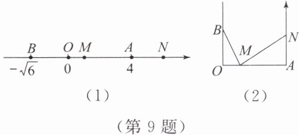 9. (创新考法)如图(1),数轴上从左到右依次有 B,O,A,N 四个点,其中点 B,O,A 表示的数分别为 -√6,0,4,线段 OA 上有一点 M. 如图(2),将数轴在点 O 的左侧部分绕点 O 按顺时针方向旋转 90°,将数轴在点 A 的右侧部分绕点 A 按逆时针方向旋转 90°,连接 BM,MN. 若△OBM 和△AMN 全等,则点 M 表示的数为