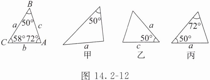 - 跟踪练习1:如图14.2-12,已知△ABC的三条边和三个角,则甲、乙、丙三个三角形中,与△ABC全等的三角形是(