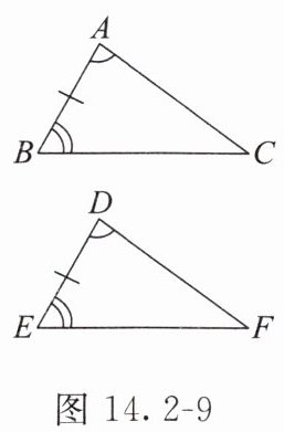 分别相等的两个三角形全等(可以简写成“角边角”或“ASA”)。数学语言:如图14.2-9,在△ABC和△DEF中,如果