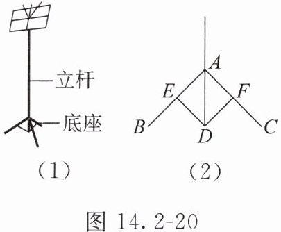 - 跟踪练习2:图14.2-20(1)是一乐谱架示意图,利用立杆可进行高度调节;图14.2-20(2)是乐谱架底座部分的平面图,其中支撑杆AB = AC,E,F分别为AB,AC的中点,ED,FD是连接立杆和支撑杆的支架,且ED = FD。立杆在伸缩过程中,总有△AED≌△AFD,其判定依据是(