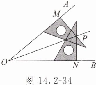 - 跟踪练习2:用三角尺画角的平分线:如图14.2-34,先在∠AOB的两边分别取OM = ON,再分别过点M,N作OA,OB的垂线,交点为P,连接OP。得到OP平分∠AOB的依据是(