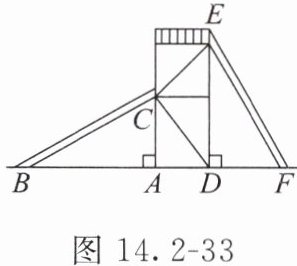 - 例2:如图14.2-33,有两个长度相同的滑梯靠在垂直于地面的架子上,左边滑梯的高AC与右边滑梯水平方向的长DF相等。若∠CBA = 36°,则∠EFD = ( )。