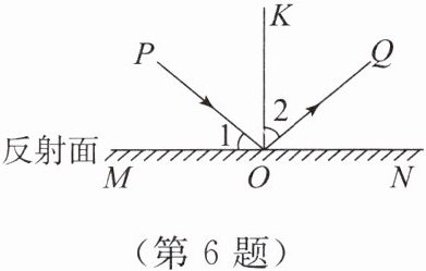6. (跨学科融合)光的反射示意图如图所示,其中PO是入射光线,OQ是反射光线,法线KO ⊥ MN。若∠1 = 40°,求∠2的度数。