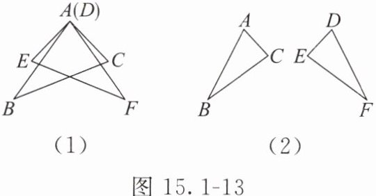 【例2】如图15.1-13,已知△ABC与△DFE关于直线l对称,请仅用无刻度的直尺,在图(1)与图(2)中分别作出对称轴l.
