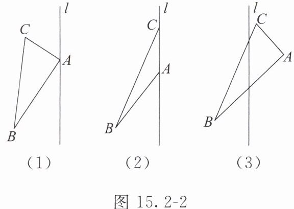 【例 1】在图 15.2 - 2 中画 $\triangle A'B'C'$,使 $\triangle A'B'C'$ 与 $\triangle ABC$ 关于直线 $l$ 成轴对称。