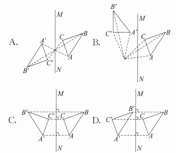 1. 下面是四位同学所画的与 $\triangle ABC$ 关于直线 $MN$ 对称的图形 $\triangle A'B'C'$,其中正确的是(