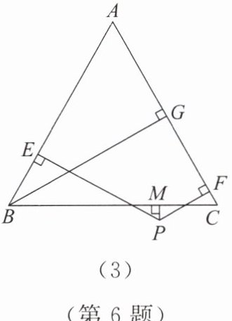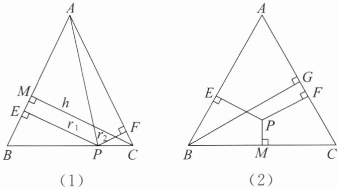 因为 $PE\perp AB$,$PF\perp AC$,$PM\perp BC$,$BG\perp AC$,所以$\frac{1}{2}AB\cdot PE+\frac{1}{2}AC\cdot PF+\frac{1}{2}BC\cdot PM=\frac{1}{2}AC\cdot BG$.