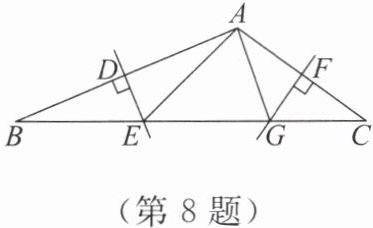 8. 如图,在 $\triangle ABC$ 中,$\angle BAC > 90^{\circ}$,$AB$ 的垂直平分线交 $BC$ 于点 $E$,交 $AB$ 于点 $D$,$AC$ 的垂直平分线交 $BC$ 于点 $G$,交 $AC$ 于点 $F$。当 $\triangle AEG$ 是等腰三角形时,$\angle B$ 与 $\angle C$ 不可能有的数量关系是(
