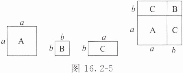 - 例2:设有边长分别为 $a$ 和 $b$($a>b$)的A类和B类正方形纸片以及长为 $a$ 且宽为 $b$ 的C类长方形纸片若干张。如图16.2 - 5,要拼一个边长为 $a + b$ 的正方形,需要 $1$ 张A类纸片、$1$ 张B类纸片和 $2$ 张C类纸片。若要拼一个长为 $3a + b$、宽为 $2a + 2b$ 的长方形,则需要C类纸片的张数为( )。