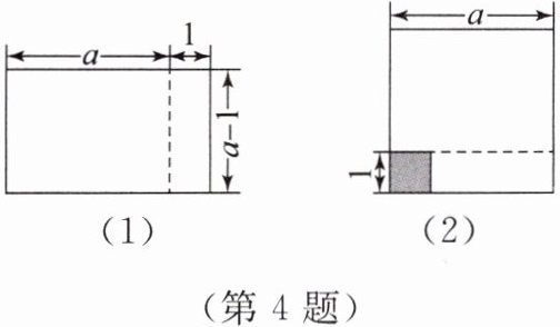4. 如图(1),有一个长为 $a + 1$、宽为 $a - 1$ 的长方形,将其沿虚线剪开,得到两个小长方形,再将这两个小长方形拼成如图(2)所示的图形(非阴影部分),这两个图能解释的一个等式是