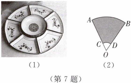 7. 中国美食讲究色香味美,精美的摆盘也会让美食锦上添花。图(1)中的摆盘,其形状是扇形的一部分,图(2)是其几何示意图(阴影部分为摆盘),通过测量得到AC= BD= 10cm,OC= OD= 3cm,圆心角为60°,则图(2)中摆盘的面积是(