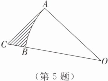5. 如图,扇形OAB的半径为6cm,AC切$\overset{\frown}{AB}$于点A,交OB的延长线于点C。如果$\overset{\frown}{AB}$的长为3cm,AC= 4cm,则图中阴影部分的面积为(