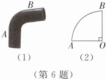 6. 如图(1)是一段弯管,弯管的部分外轮廓线如图(2)所示是一条圆弧$\overset{\frown}{AB}$,圆弧的半径OA= 20cm,圆心角∠AOB= 90°,则$\overset{\frown}{AB}$的长为(
