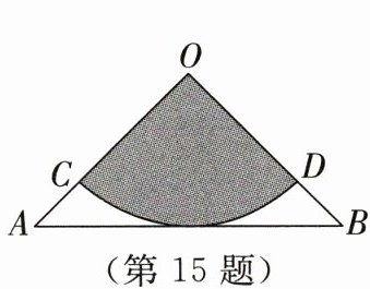 15. 如图,从一张腰长为 $ \sqrt{2}\ cm $ 的等腰直角三角形铁皮 $ OAB $ 中剪出一个最大的扇形 $ OCD $,用剪下的扇形铁皮围成一个圆锥的侧面(不计损耗),则该圆锥的底面半径为 ______ $ cm $.
