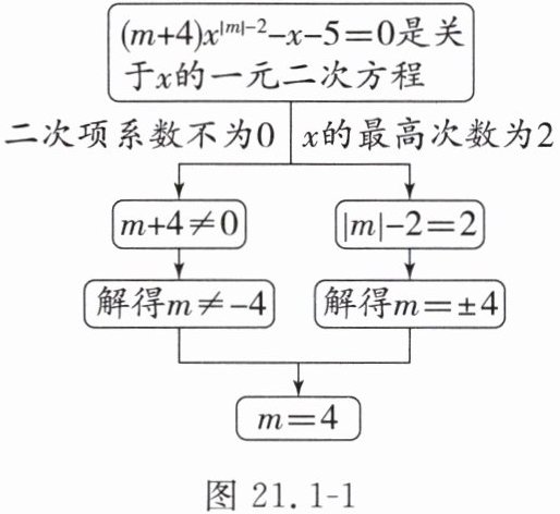 【例 1】若 $(m + 4)x^{|m| - 2} - x - 5 = 0$ 是关于 $x$ 的一元二次方程,则 $m$ 的值为( )。