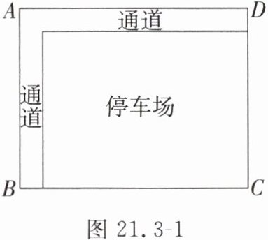 - 跟踪练习:为了解决停车难的问题,某小区计划将矩形空地ABCD改建,AD = 100m,AB = 80m。如图21.3 - 1,将在矩形空地沿着边AD和AB修建宽度相同的通道,剩余部分为停车场。若停车场的面积为$6300m^2,$求通道的宽度。